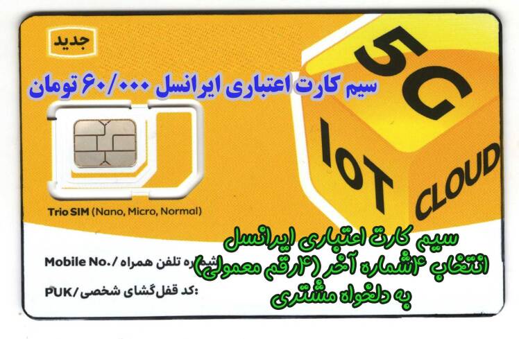 سیم کارت اعتباری ایرانسل شماره معمولی ، انتخاب 4شماره آخر به دلخواه شما+3گیگ اینترنت هدیه ۶۰,۰۰۰ تومان فروش ویژه